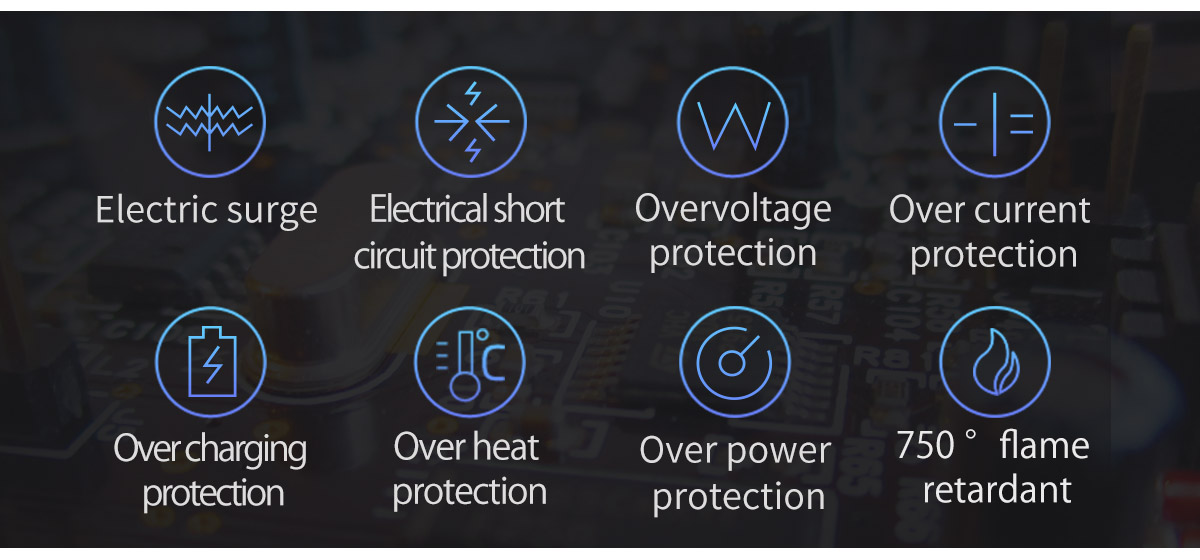 Overvoltage protection Surge protection Over current protection Short circuit protection Over charging protection Over heat protection Over power protection 750。Flame retardant