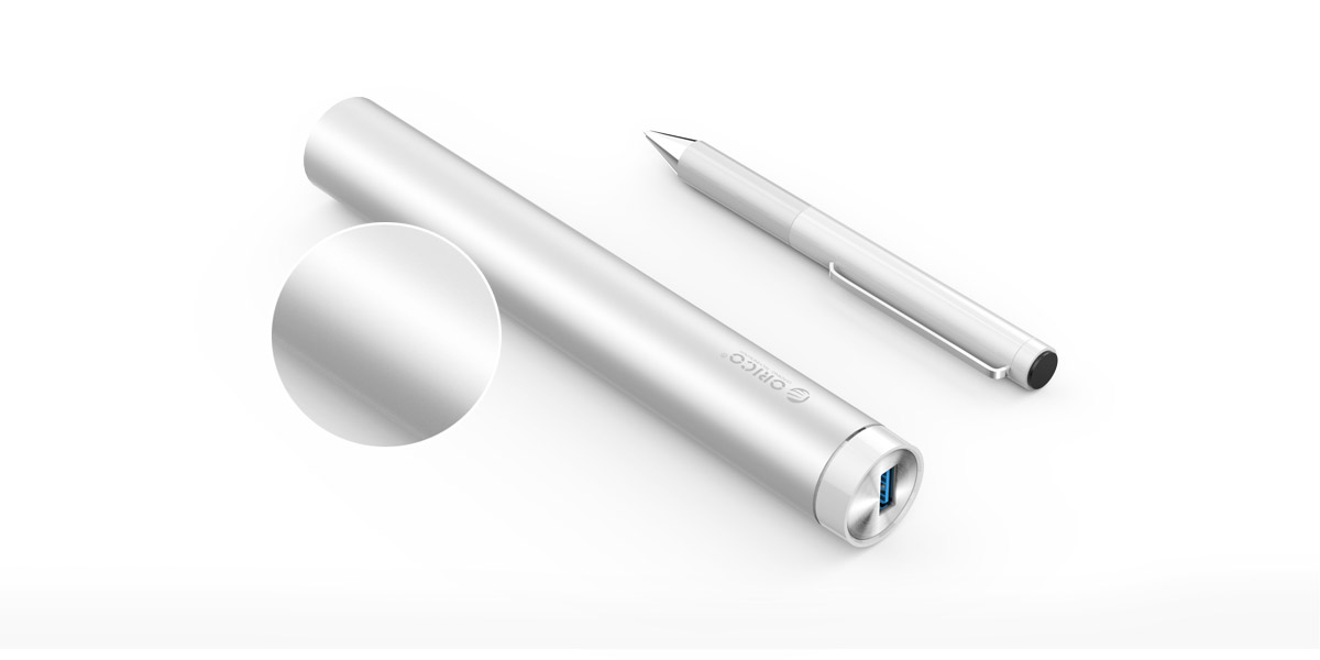 Sleek cylinder chassis made of aluminum alloy, whose two sides adopt CD stripe design, is processed by cutting and anodic oxidation technology, length the same as a pencil, diameter the same as a coin; carry or put it on the desk, whichever you want.