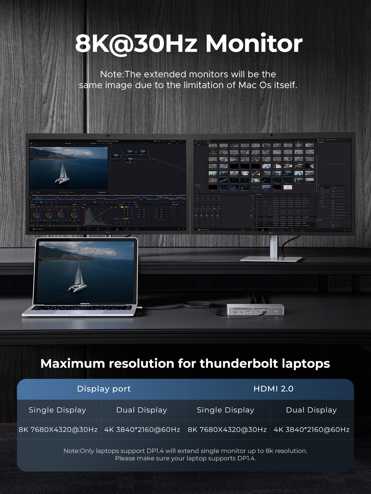 Thunderbolt 4 Uplink Interface PD 85W, Thunderbolt 4 Downstream Interface PD 15W Support daisy chain, USB-C 3.2 gen2 10G*1, USB-A 3.2 gen2 10G*1, USB-A 2.0 480Mbps*2, RJ45 Gigabit Ethernet port, SD/TF 3.0 card slot, 3.5MM earphone integrated interface, DP 1.4 8K30HZ/4K60HZ, HDMI 2.0 8K30HZ/4K60HZ