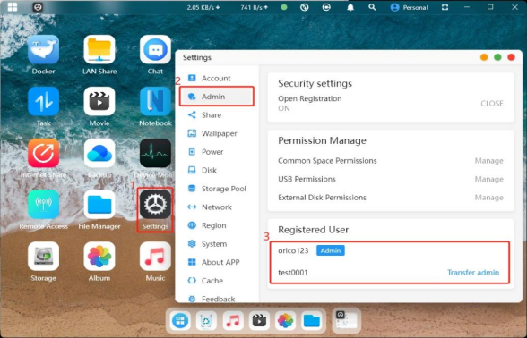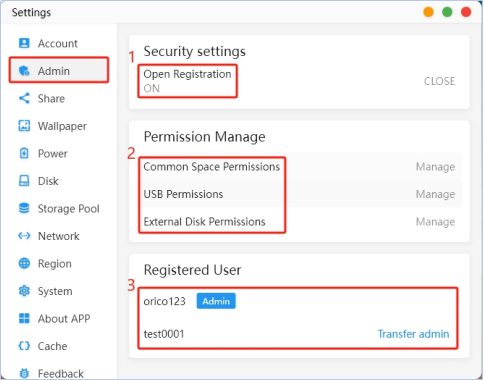 · By default, the first registered user is the administrator. The administrator can manage the device through " Settings". · The "Open Registration" option in "Security Settings" is enabled by default. If you need to pause user registration, you can turn it off. · In "Permission Management", you can restrict access to public space, USB external storage, and external disk permissions for certain users. · In "Registered Users", you can view the number of registered users on the device and transfer administrator permissions.