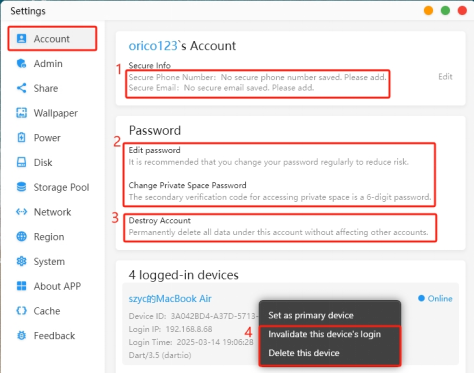 · When the NAS is logged in on multiple devices, you can log out and delete the login information for those devices.